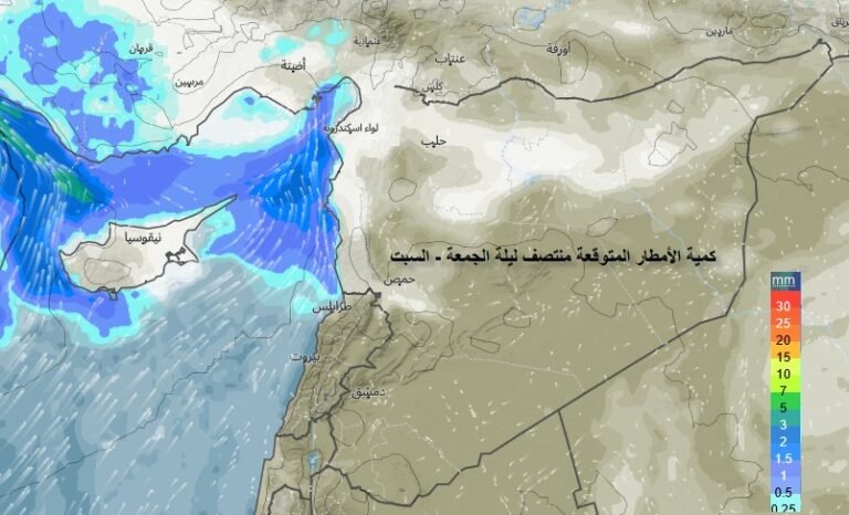 تبدأ الهطولات في المنطقة الساحلية والجزيرة والمناطق الشمالية والوسطى وتعم معظم مناطق القطر ظهر الخميس حيث ستكون غزيرة أيضا في الجنوب السوري ومحافظة حلب والقنيطرة وأقصى الشمال الشرقي في الجزيرة السورية قبل أن تضعف الفعالية كثيرا صباح الجمعة وتحول الجو إلى بارد نسبيا مع تقدم الكتلة الباردة من المنخفض ويتوقع هطولات تزيد عن 20 ملم وأكثر من ذلك في بعض المناطق .